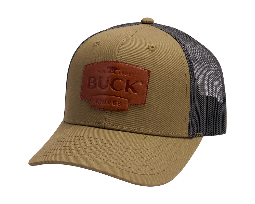 Six-panel snapback trucker hat in O.D. green with brown Buck Knives logo leather patch. Mid-profile with pre-curved bill. O.D green twill and gray mesh. Snapback closure, adjustable fit. One size fits most. Imported.