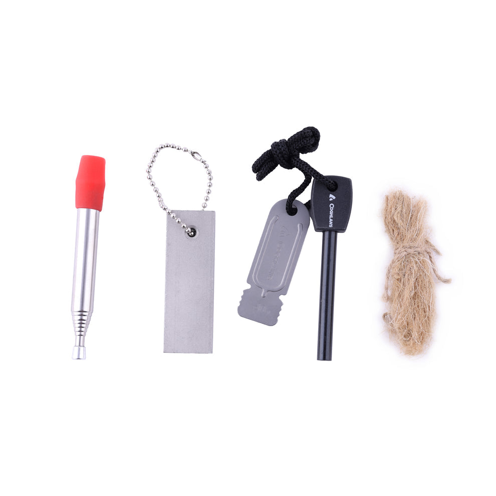 Contains: magnesium bar, flint rod, flint scraper tool, bellow, jute tinder, and tin storage can