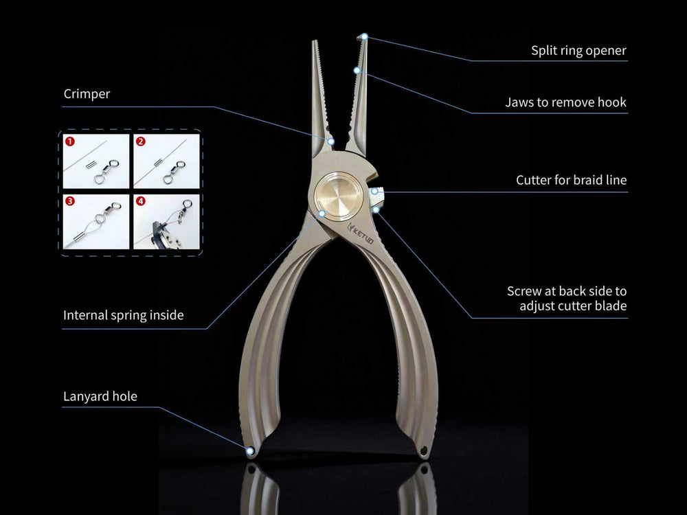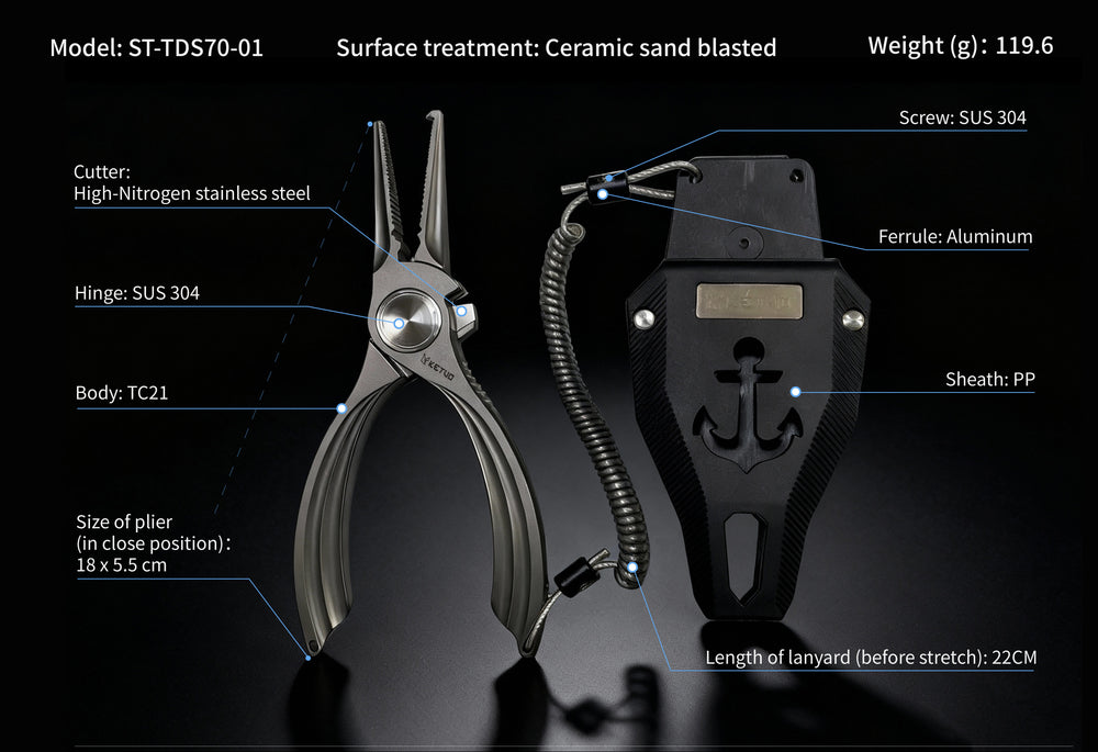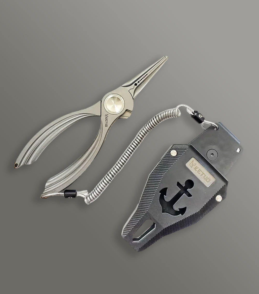 The Ketuo Kedge is a premium titanium-handled fishing plier that blends elegance with functionality. Its winged-style milled handle channels provide both a refined aesthetic and secure grip, making this plier as visually striking as it is practical. Built from high-grade TC21 titanium, the Kedge delivers superior strength, corrosion resistance, and long-term durability in demanding marine environments.