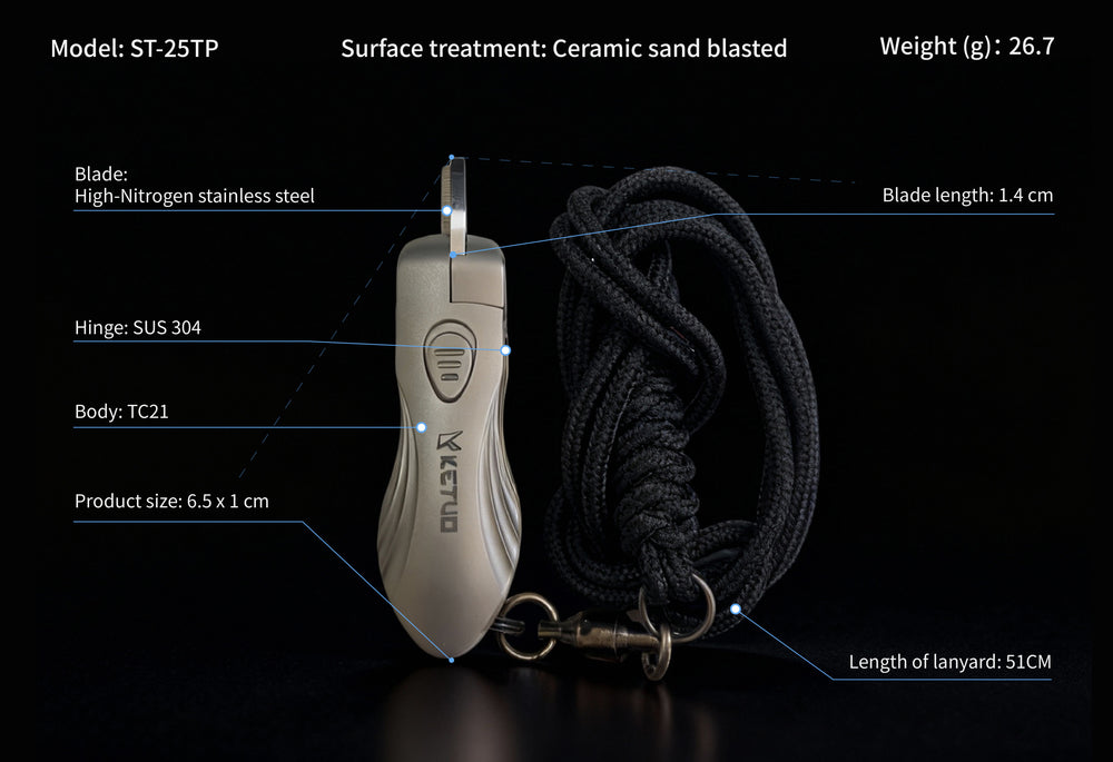 The 5.3 cm (2.09 in) handle is constructed from TC21 titanium alloy, Ti-6Al-2Zr-2Sn-2Mo-1.5Cr-2Nb, providing strength, lightweight balance, and resistance to the elements. SUS-304 stainless steel hinge and external spring components ensure smooth operation and consistent tension during repeated use. A 51 cm (20 in) lanyard allows for secure attachment and easy access while fishing.