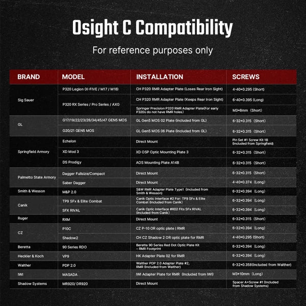 Most Common Footprint: By adopting the de facto industry standard (Ruggedized Miniature Reflex, or 407c/507c footprint), Osight C is a versatile addition to many full-size and compact pistols. Osight picatinny mounts add even more possibilities with both high and low options that will work with most rifle applications.
