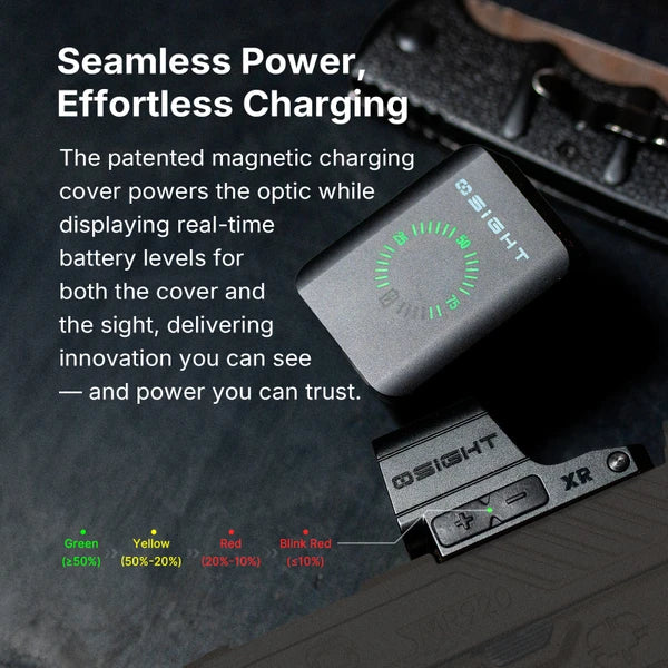 Industryʼs First Patented Magnetic Charging Cover: The Osight XR brings a Patented Magnetic Charging Cover, the first and only of its kind in the industry, now upgraded with a redesigned form factor and integrated logo. It charges the optic while displaying real-time battery levels for both the cover and the sight, delivering innovation you can see and power you can trust.
