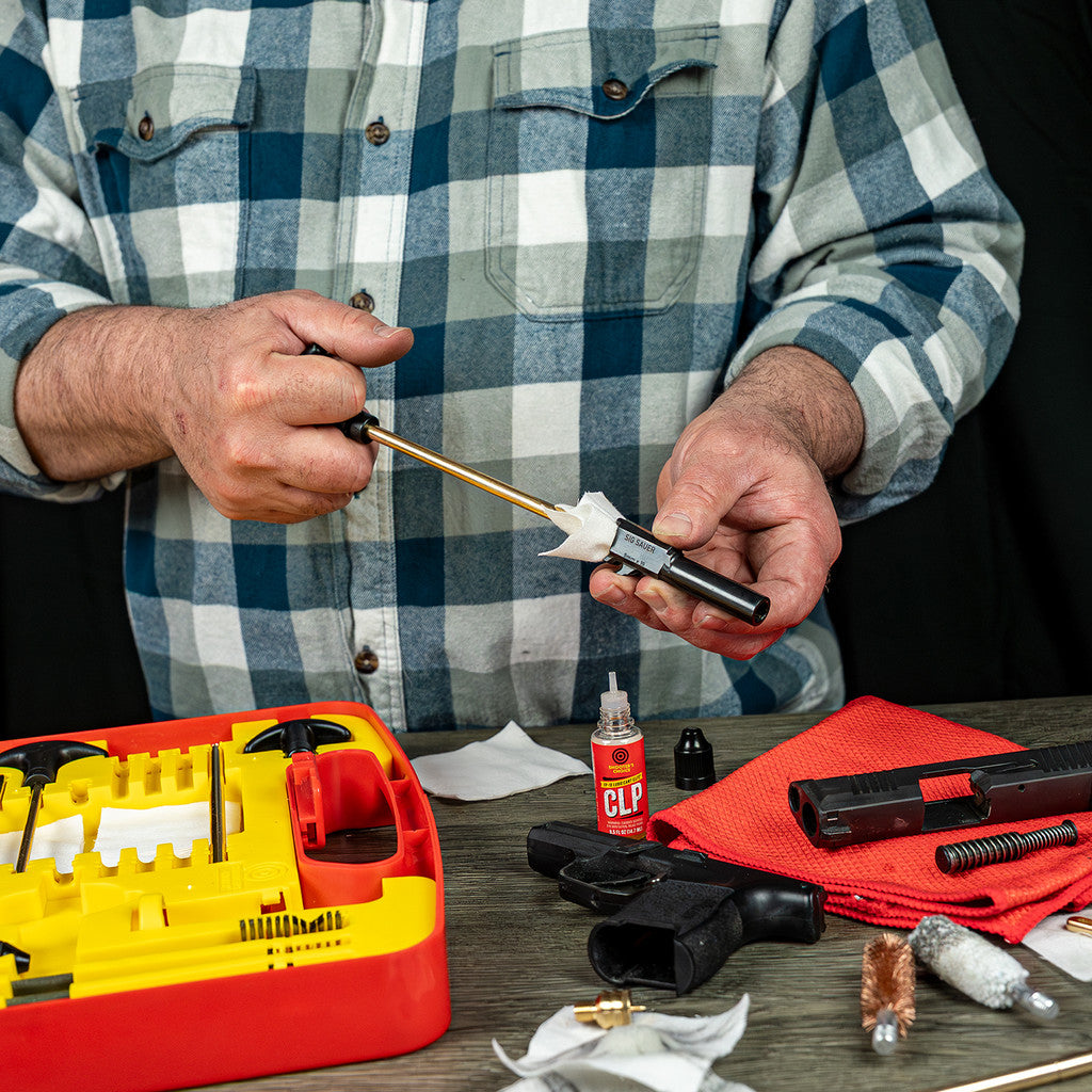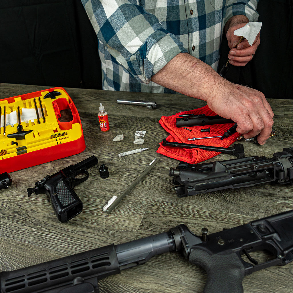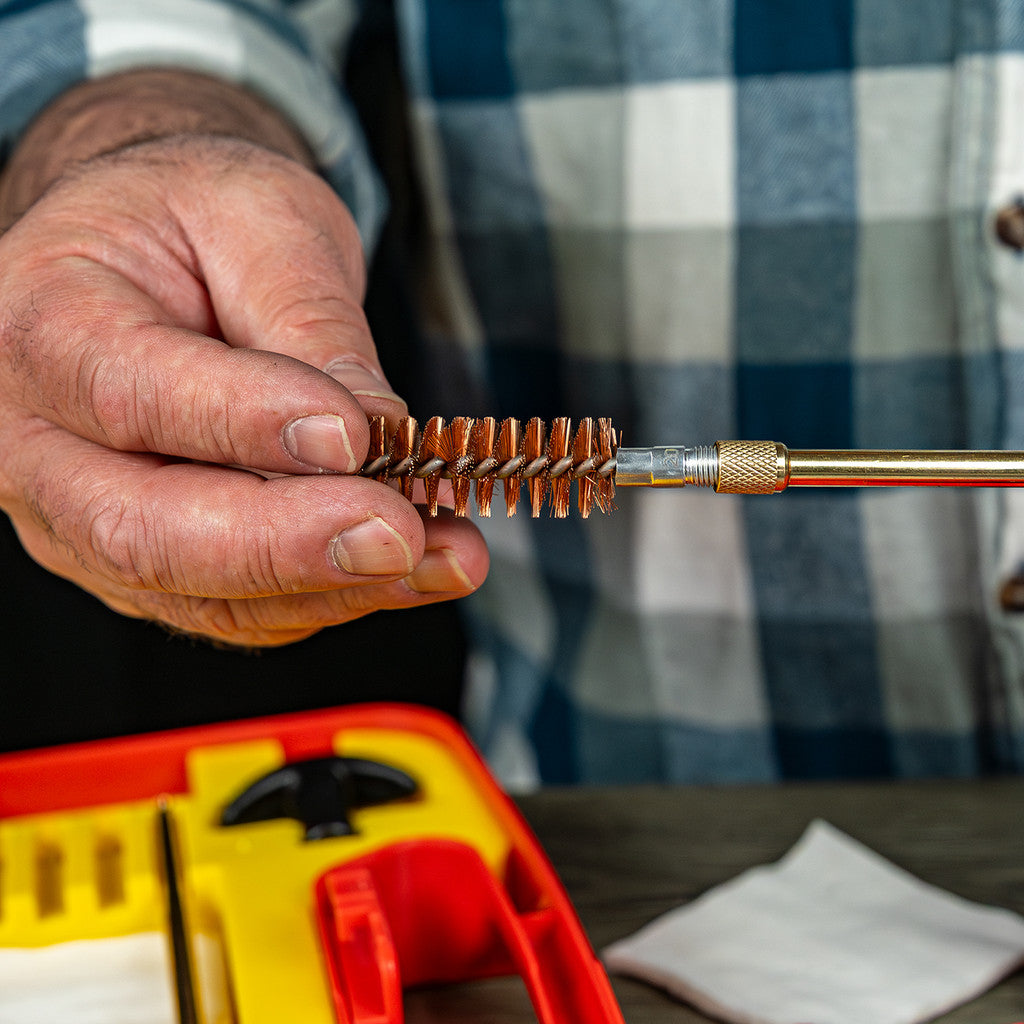 Get all your cleaning gear in one convenient kit with the Shooter’s Choice Universal Gun Cleaning Kit for Rifles, Pistols & Shotguns. This complete kit includes 10 brushes, 10 mops and 10 brass pierce point jags and cleans a variety of firearms from .22 caliber to 12 gauge. Two different diameter brass rod sets with swivel handles are included – to ensure you have the right rod for all your firearm types. Attach the separate T-handle to a rod section to use in conjunction with the 5.56mm chamber brush. Slotted tips, 3 different size cotton patches and muzzle guards help ensure an effective clean of your bore. We’ve also include a 0.5 fl oz bottle of Shooter’s Choice FP-10 Lubricant Elite® CLP to ensure your firearm is properly cleaned, lubricated and protected.