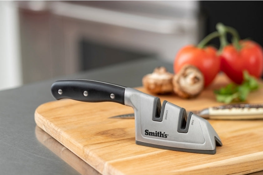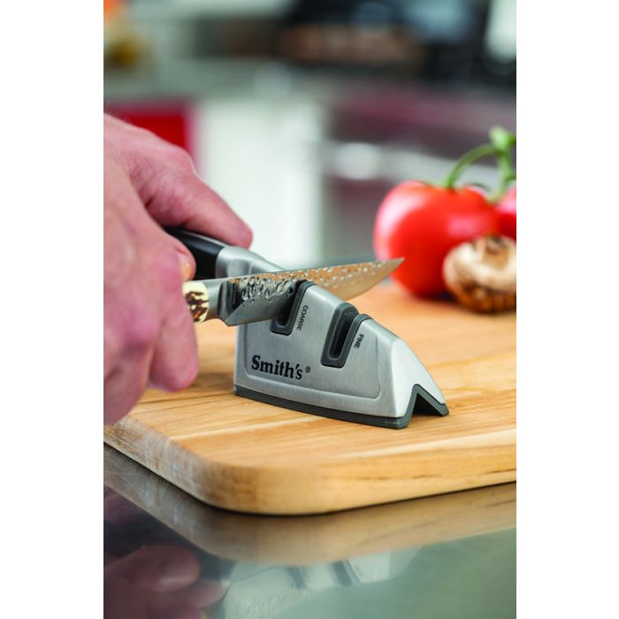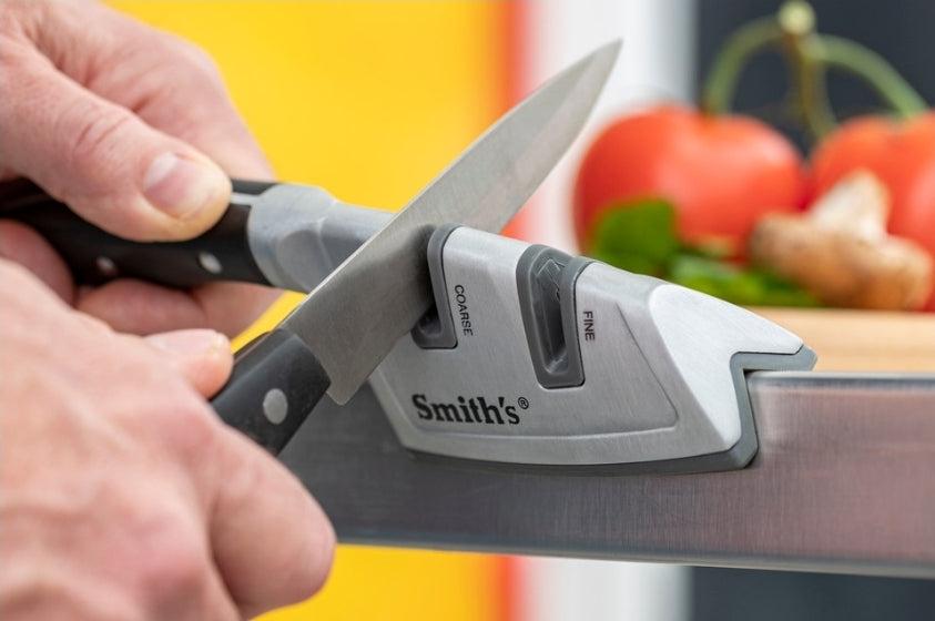 Smith's Gourmet Diamond Pull Over EdgeGrip sharpener is designed with two pre-set angle slots. The coarse pre-set diamond slot will remove nicks and gaps from the edge of our knife. The fine pre-set slot is equipped with tri-angular shaped ceramic stones used hone the edge of your knife. The sharpener has a non-slip base giving you added stability while sharpening your knives and Smith's patented Edge Grip technology allows for sharpening on a table or countertop edge to prevent your larger knives from dragging over the surface. This Edge Grip sharpener can be used to sharpen straight and serrated knives.