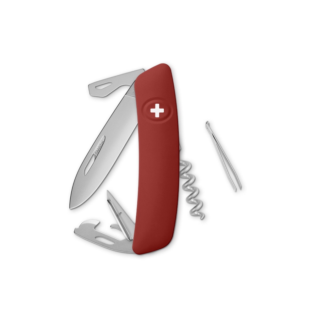 Safety lock, Tweezers, 47 mm, “Sommelier” (waiters) corkscrew features a 5-turn spiral, Punch / reamer awl with sewing eye, Bottle opener with screwdriver No. 3 & wire bender, Can opener with screwdriver No. 1, Blade, 75 mm