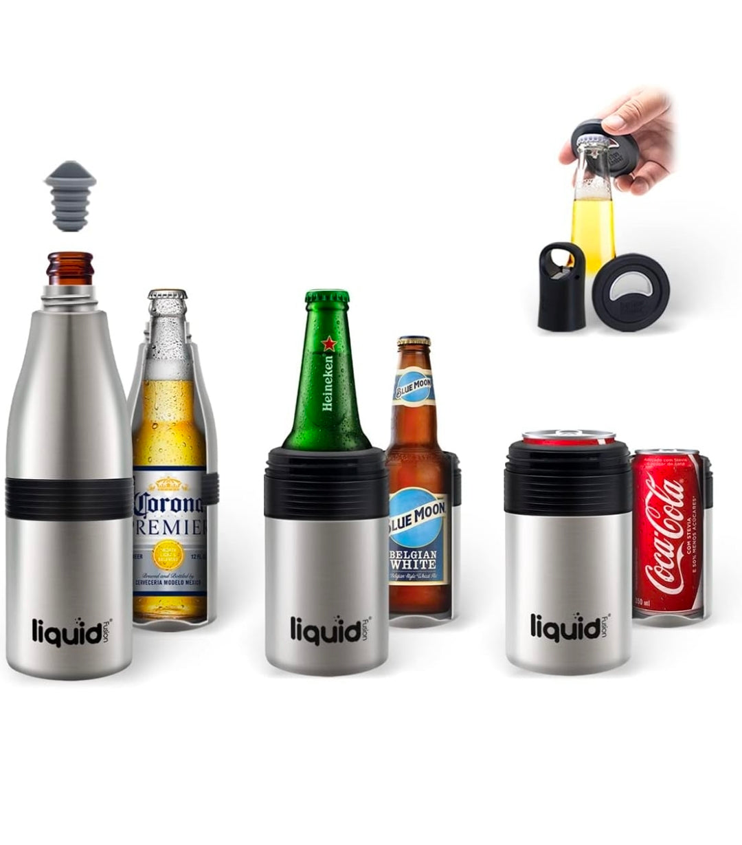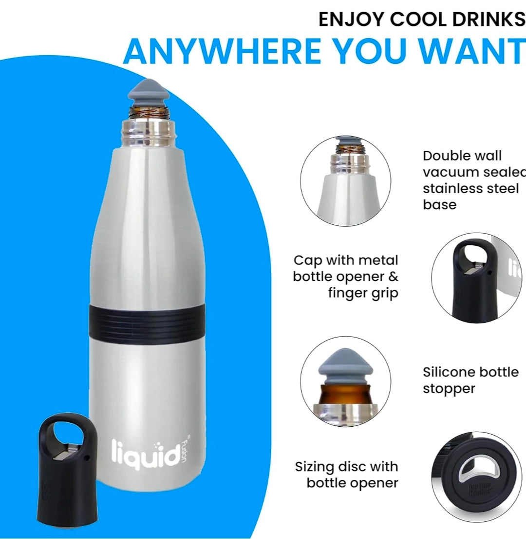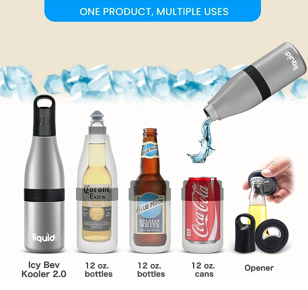 STAINLESS STEEL INSULATOR: Our insulated Icy Bev Kooler has a high-end look for stylish trendsetters and rugged durability. Also, it has a built-in bottle opener and a silicone stopper to re-seal your used bottles.